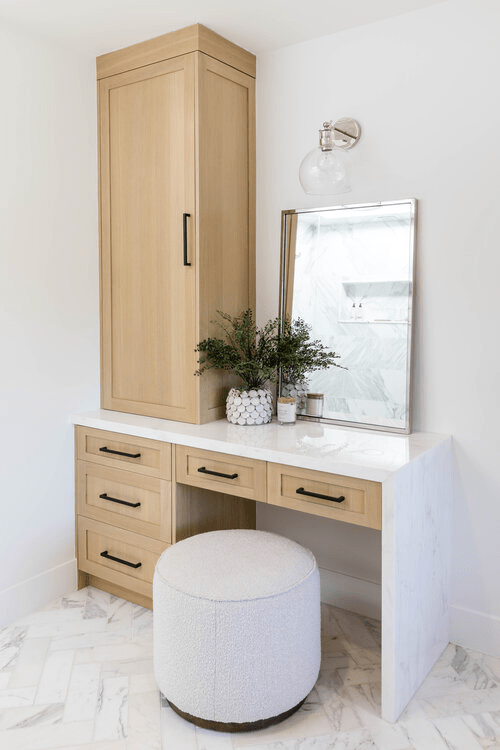 This quartz is beautiful in person! This would be a good countertop for our primary bath because it’s durable and would compliment the shower tile. Since it won’t be too close to the marble, I don’t think the different materials would clash.