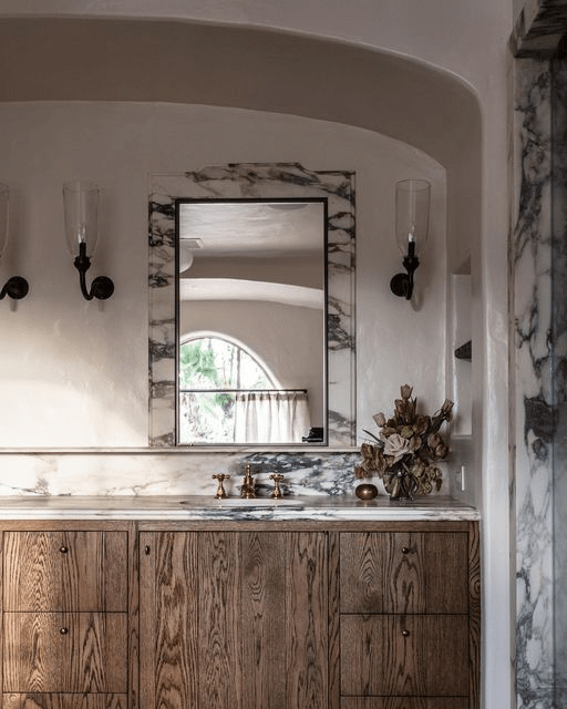 Again the wood grain! I love it! I like how dainty and shiny the faucet is. And the marble is exquisite!! The variation is linked as Calacatta Monet. These marbles are so breathtaking to me that I would rather put in something temporary and cheap in our new house’s bathroom until we can save up for something so beautiful! (Of course would have to get my fiancé on board with that) Although I stand by my previous statement that I would not do well with a marble vanity.. but as a little backsplash piece? Doable!