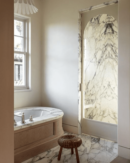 For this picture, I’m primarily in love with the tub (water damage safe? dunno, but it’s gorgeous) and the flooring. I am not a fan of bookmatched slabs, they just give me the creeps personally. The concept is there, but in actuality, they tend to look like something from Stranger Things. Don’t believe me? Here’s proof!