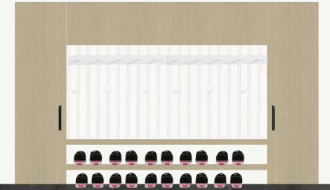 Above is a pretty common layout for mudroom storage, but I made some tweaks to have two rows of coat hooks (for both taller and shorter height items or people) and shoe storage that accommodates the more common low shoe height (versus boots). I prefer entry/mudroom storage layouts that are open like this versus cubbies, mainly because which cubby does a guest use? What happens if you have 4 cubbies but 5 kids? I think it’d be simpler (and less expensive) to just do something more open.