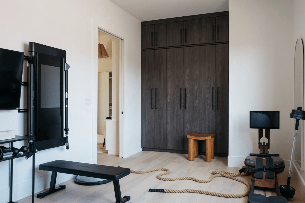 If I haven’t already blogged about it, we’re hoping to have a closet/workout room connected to our primary bedroom or bathroom. One of the designers I follow actually did this in her own house she built, although the closet in the fitness room is just her husband’s:
