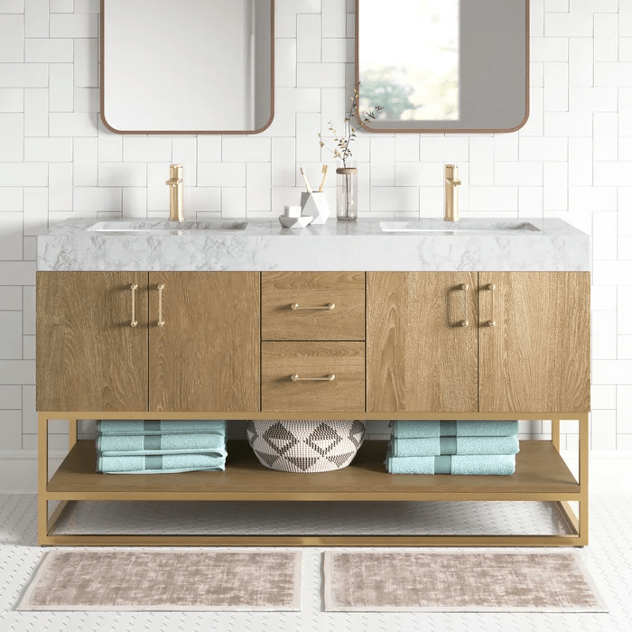 Above is an example of a prefab vanity that looks really nice! What we choose will all come down to whether it makes more sense to do prefab, nice cabinetry + budget countertop, or even just go with what we want!