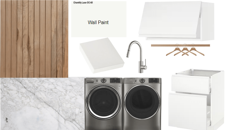What I’m most excited for in this design is of course the marble tile! It’s gorgeous, and with it being used in a semi-small space, it shouldn’t affect the budget too much. I also would love to use some floor to ceiling wood paneling on the ‘other’ wall I referenced (the long blank wall parallel to the more functional wall). I think the wood looks SO good with the marble, and it would be a fun surprise to catch a glimpse of the wood in an otherwise white laundry room.