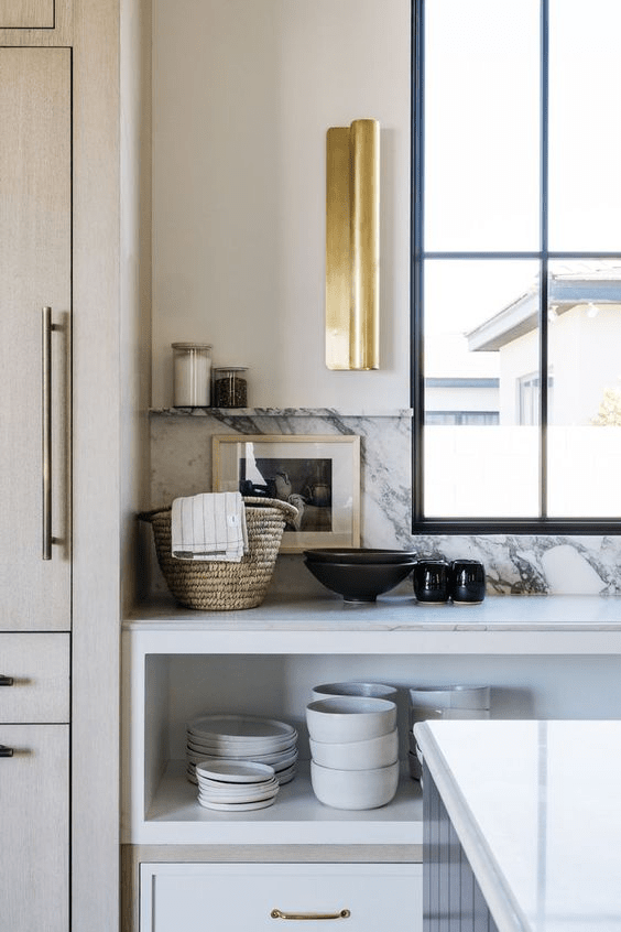 I also haven’t seen many designs with open shelving in the lower cabinets. It’s very interesting, and I’m sure our girlies (cats) would love jumping up there and dirtying our dishes!