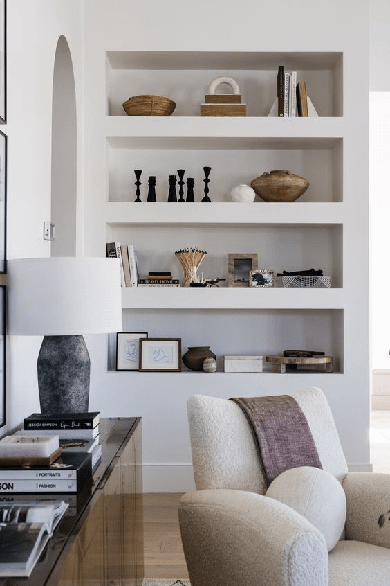 I thought this built in shelving was very cool! I would love to explore having something like this in our new house. In our entry way design, we currently have a barn door on each side of the entry, which makes the typical entryway table seem tricky. If we were to create a built in like above (without the shelves), we could have a mirror and some sconces recessed inside it, without getting in the way of a barn door. I’m loving this idea!