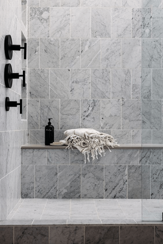 Kristin’s primary bath shower. This marble inspired our shower design! When there’s enough light coming into the space, this type of marble is the prettiest light gray!