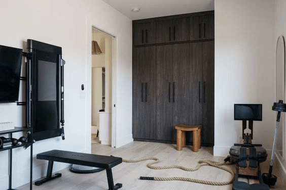 This closet/fitness room came at the right time! I was considering doing something like this before I saw her home’s foot print, but I didn’t know if it was too crazy. The closet is actually her husband’s closet, and hers is a large walk in through that doorway.