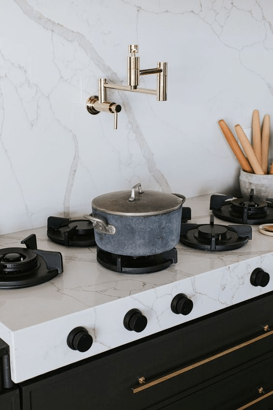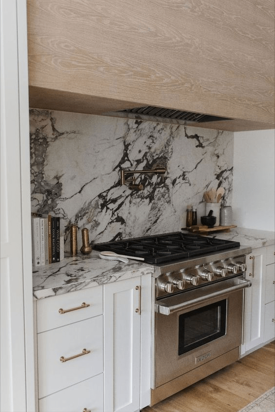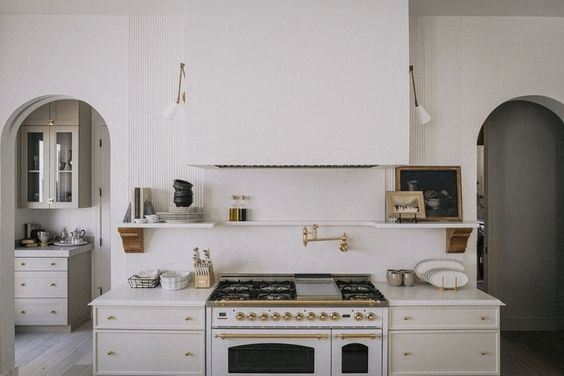 I love the reeding on either side of the range hood. The creamy and brass colors in this kitchen make it cozy and welcoming.