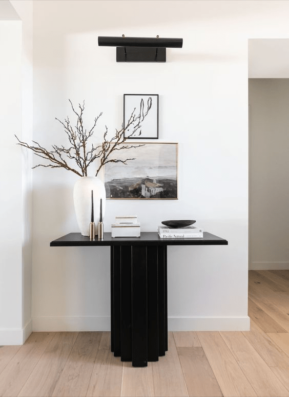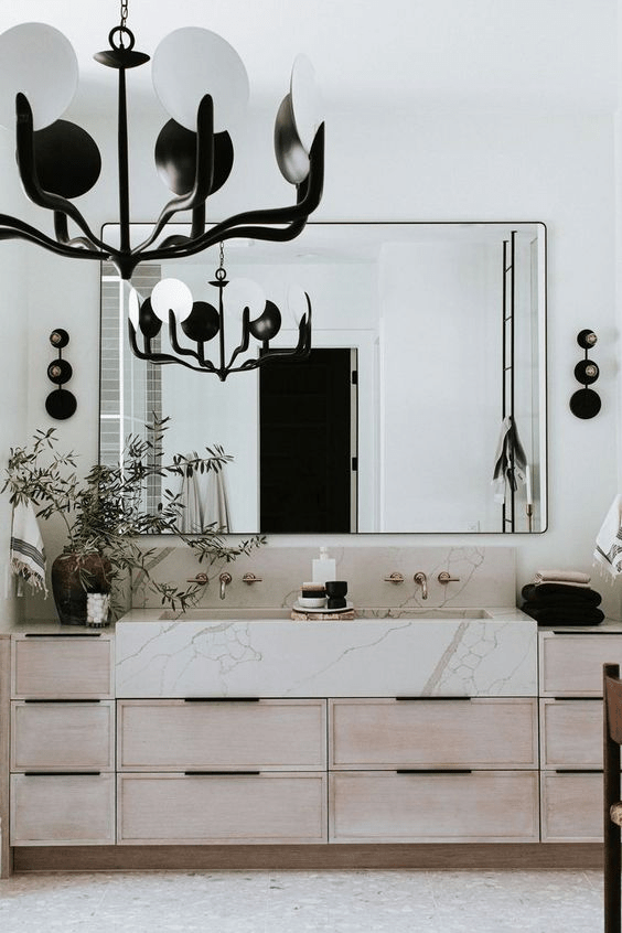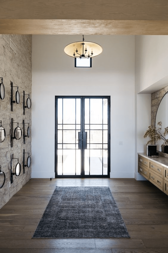 I love the light they used in here! On the left of this entry, they used exterior sconces as a design feature. On the right, they have a huge custom floating cabinet with a ginormous mirror! It’s the perfect scale for this large space.