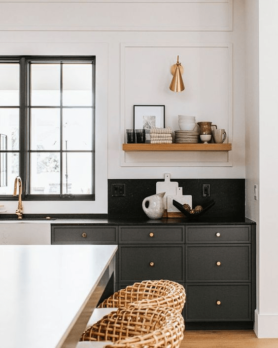 I love the look of this dark countertop/cabinet combo! I also love how the floating shelf is boxed in!