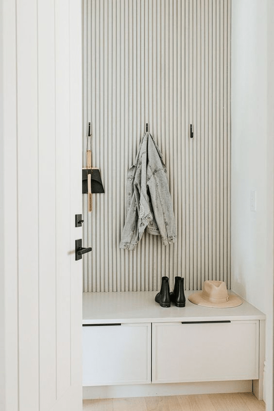 This is similar to the inspo I have for our mudroom! Love the reeded detail and the storage below.