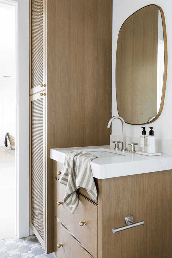 I love the wood tone of this cabinetry and the terrazzo flooring. The sink is also very interesting!