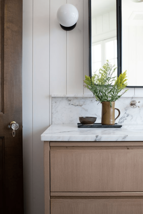 I liked the Shiplap next to the marble, and the integrated handles of this vanity!