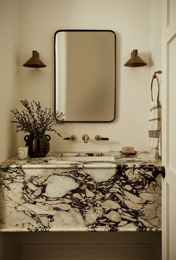Gorgeous marble! With especially funky details in the mirror and lighting choices.
