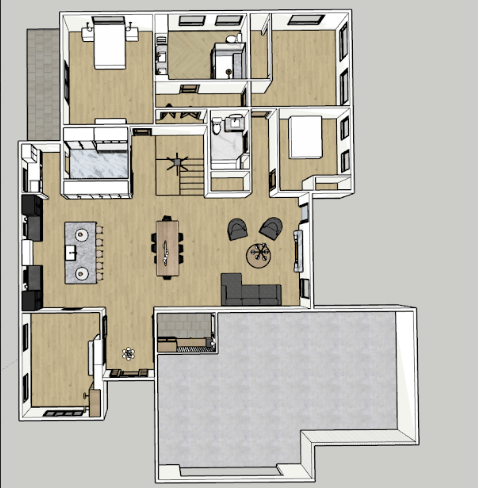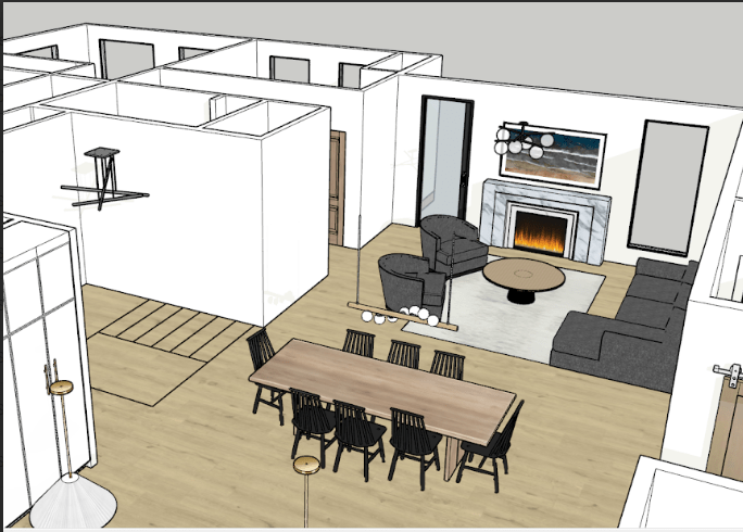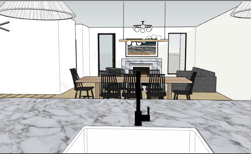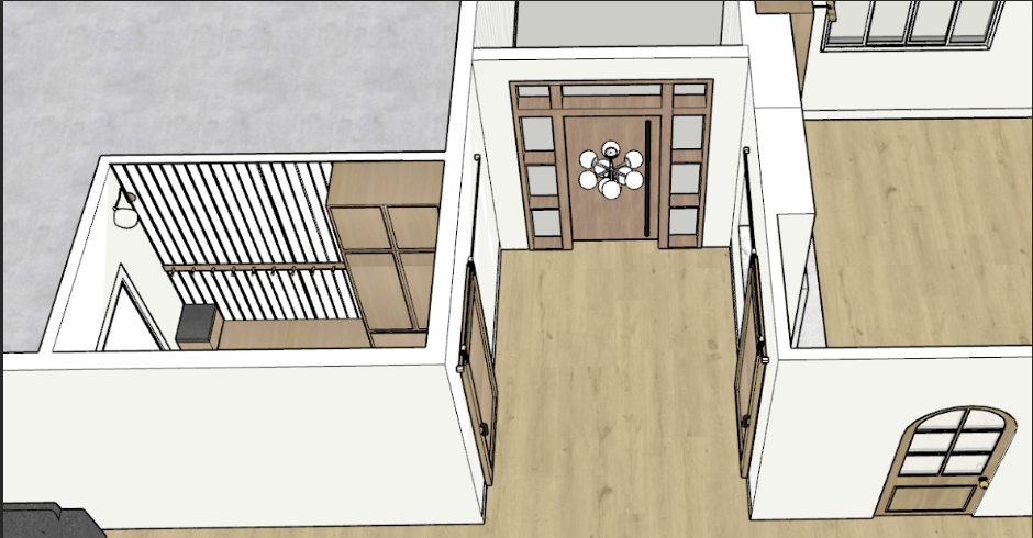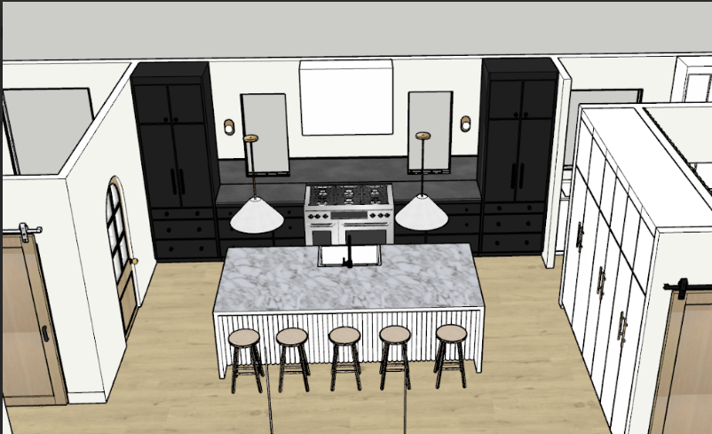 I’ll do a more in depth view of the kitchen later, but this is a good idea of the layout and color scheme we have planned. We want the cabinetry on the right to not distract from the symmetrical view we created. One of those sets of white cabinet doors would be a fridge/freezer (we’d really like a panel ready one, but tbd on budget). In the back right corner, you can also see the doorway to our pantry. Up front to the right, you can see the laundry room barn door.