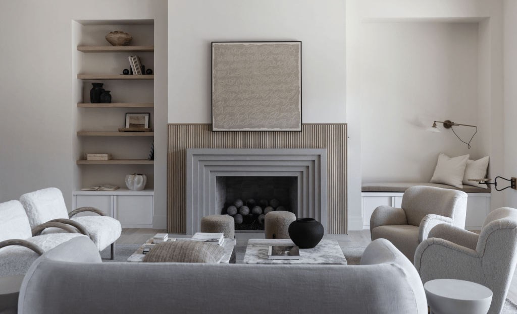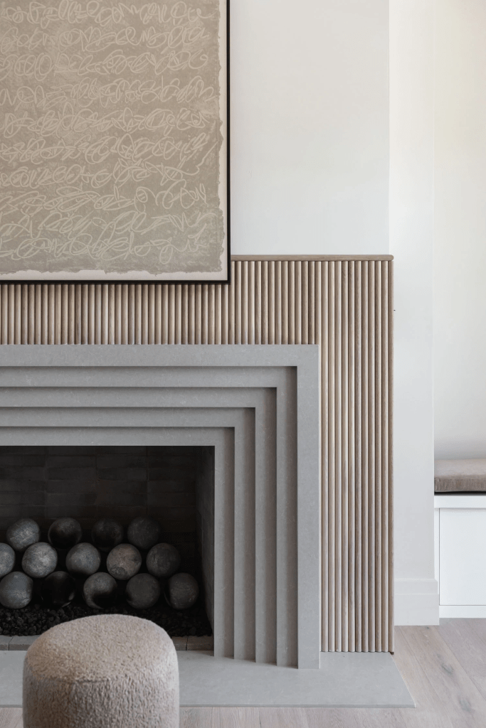 As I’ve said in at least two other posts, these designers sure do know their way around a fireplace! In their Youtube video, they say this is a tambour and quartz surround. I love the shape of the storage cabinets and their integrated handles. Fun fact about this project, the designers did not use any handle/pull hardware in this home except for in the casita kitchen! This definitely contributes to the luxury price tag.