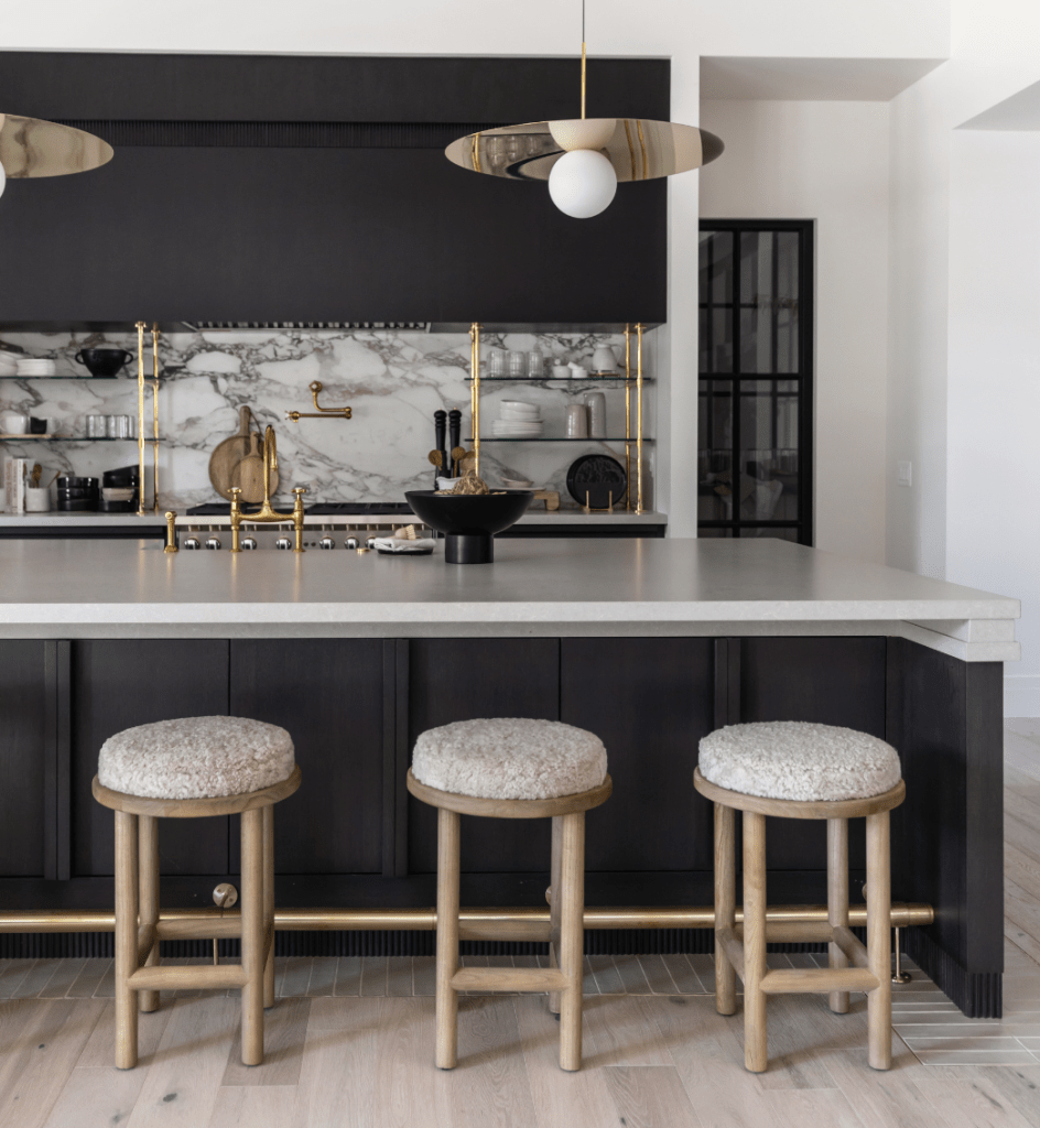 Here’s a view of the kitchen! Ugh, I love the flooring.. love the chairs.. and the marble of course is stunning. I also really like how this quartz looks like limestone. If you point your eyes to the bottom of the island, you’ll see a reeded toe kick! So unique. Also, I haven’t really seen anyone do tile around an island like that! It’s such a subtle design element once you notice it.