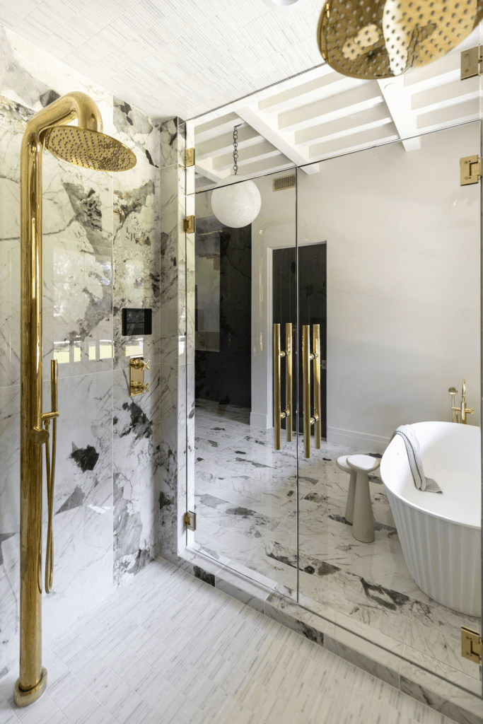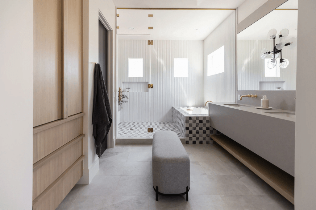 THELIFESTYLEDCO really knocked it out of the park with this bathroom! The designers said this luxurious tile is from Floor and Decor, and I know I’ve been there too much because mentally I pictured the tile they were talking about! I’ve definitely walked by it before. The high ceilings, statement lighting, and central seating area make this bathroom feel like another main area of the home!
