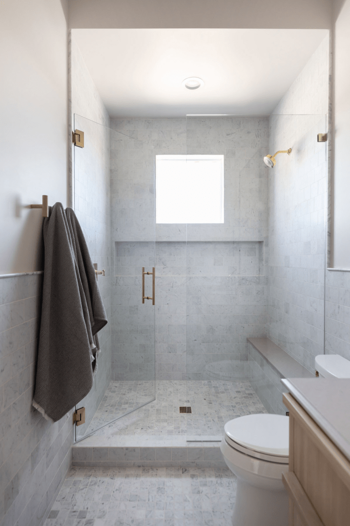 I love most of the designs in this project, but the bathrooms take the cake! In this final picture, they have tons of bianco carrara marble, which is what we’re wanting in our new shower next year. I just love how soft and pretty this bathroom is!