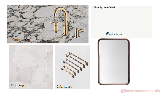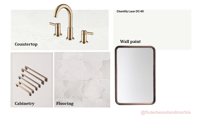 The first mood board I have is somehow bold and muted at the same time! This bathroom would feature a Calacatta Monet honed countertop, which is one of my favorite countertop materials. The flooring would be a white star and cross tile from Tilebar. For cabinetry we’d do a door design that’s clean like a slim shaker or slab front, and a simple white to not detract from the flooring or countertop. The wall paint would be a white (mainly to match with the rest of our house). Finally, the mirror, cabinet pulls, and faucet would bring out those warm, dark tones in the marble. This bathroom would definitely be a splurge, but it’s so pretty! Doesn’t hurt to dream!