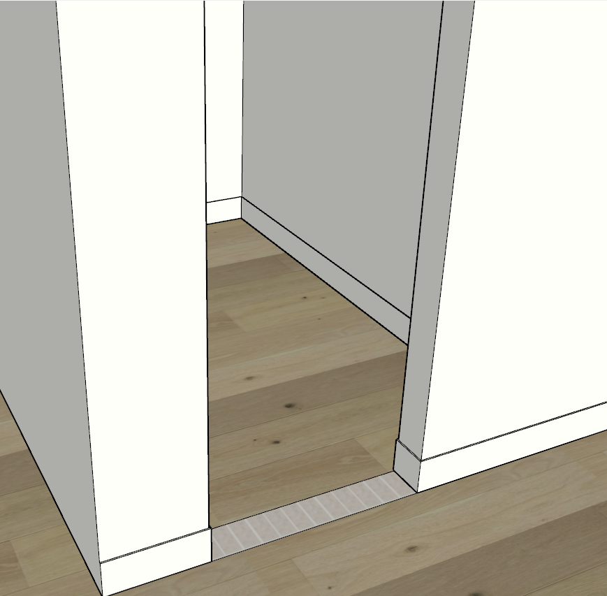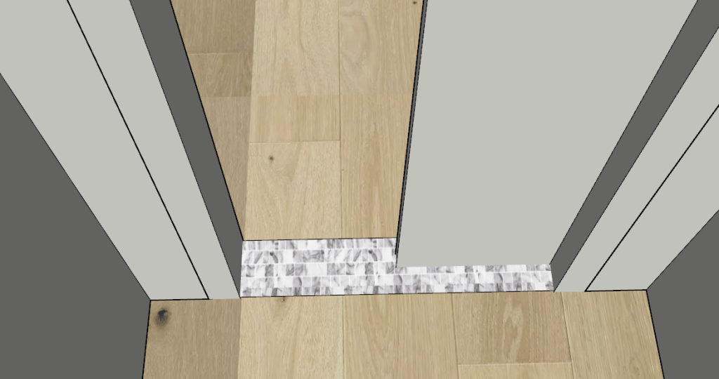 I then rendered these marble 3″x6″s and loved the subtle look of a “brick” threshold offering just the slightest change between the entry and mudroom. I was worried about the office door not looking symmetrical with the mudroom door, but their walls are already a little different with the entry having a built in console and lighting.