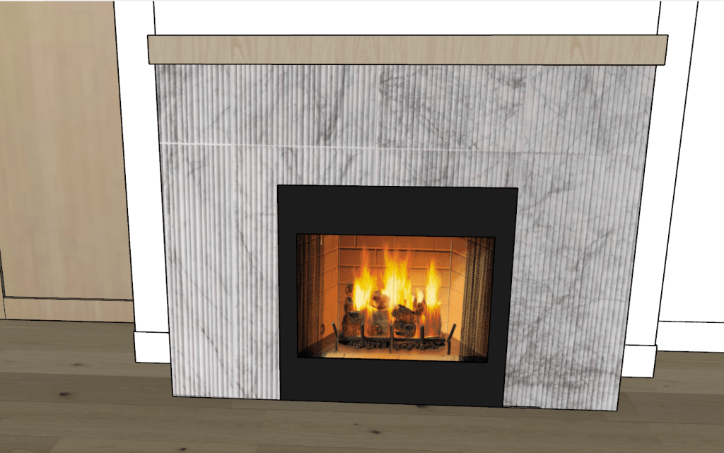 I’d been debating on whether we add a tray ceiling in the living room to give a light fixture more space to hang and not block the tv. When I finally rendered it, I loved the look!! I loved how it took a long open living space and broke it up visually. With such an expanse of white walls, I also felt that we needed a little more warmth in the living room, especially with the dark fireplace and likely dark furniture. When I rendered beams in the tray, it seemed like the wood tone versus white really did a lot for the space. The beams also drew attention to the shift in ceiling.