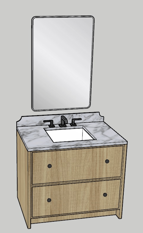 My *dream* is to custom design a bathroom vanity someday! However, I have really warmed up to prefab vanities for all non primary bathrooms. I know I seemed to state this as an option before, but it really wasn’t something I wanted to do until I realized I could circle back in 10-15 years and have the time of my life going the custom route. If I got started on picking the cabinetry and countertops for a secondary bathroom’s vanity now, I wouldn’t be satisfied with my choices until I got us way over budget! So I’m making the executive decision to hold off unless it’s somehow less expensive to build one, but even then I will stay within the price range that makes it stay the less expensive option. Until then, I will just have fun rendering my own designs, like these two vanities! Both of these vanities are very similar, and I actually just built the double vanity from the single if you couldn’t tell. I love how they look like a piece of furniture and like they have some weight to them.